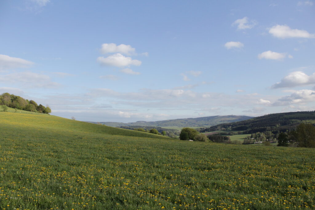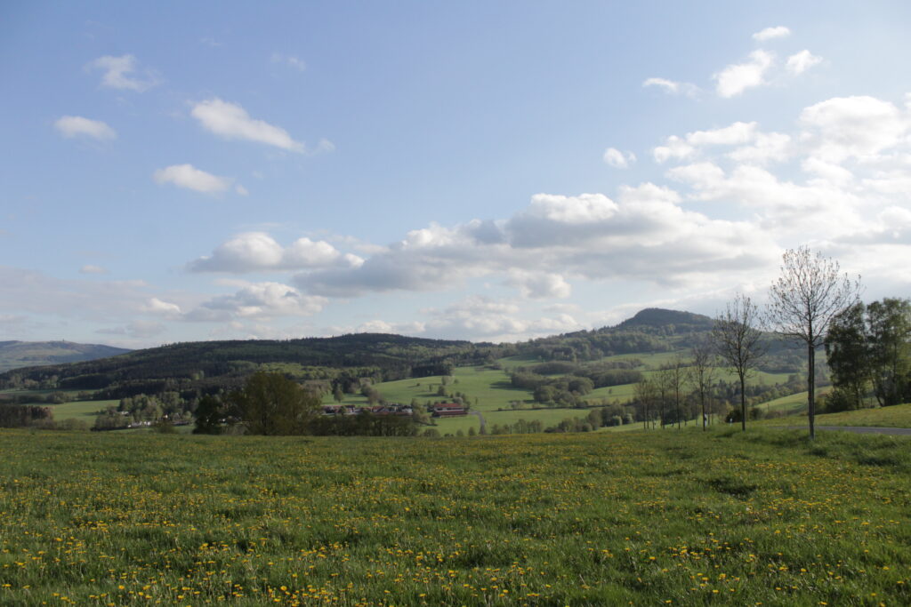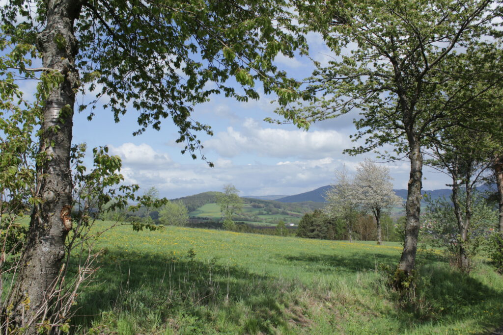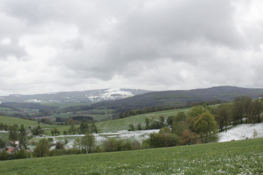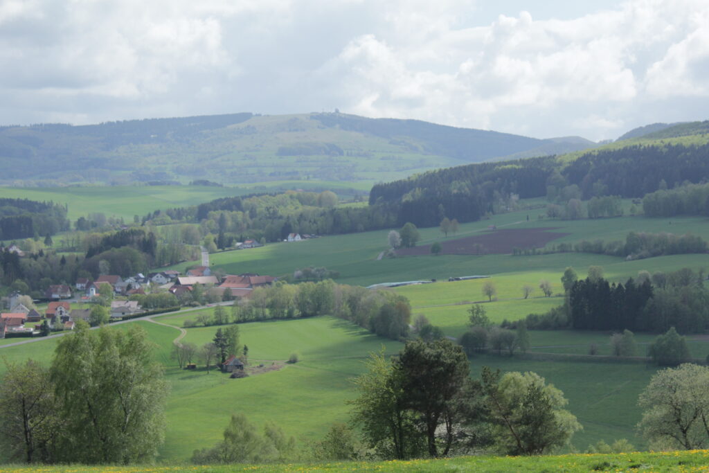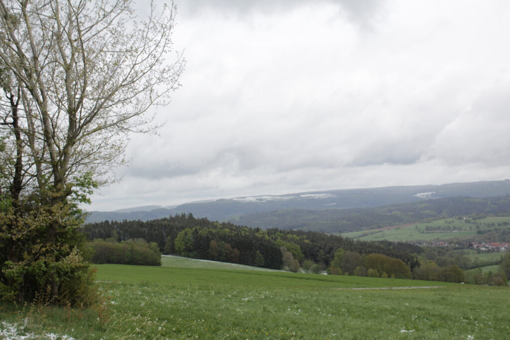 Der Harbachstein ist der Hügel, den man immer vom Wohnzimmer aus sieht. Der ist etwa 200m entfernt vom Haus. Auf der anderen Seite des Harbachsteins kann man sowohl die Wasserkuppe wie auch die Milseburg sehen (auf den beiden letzten Fotos).