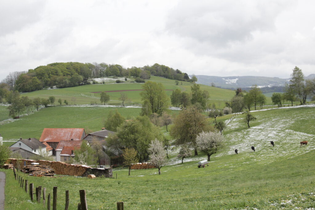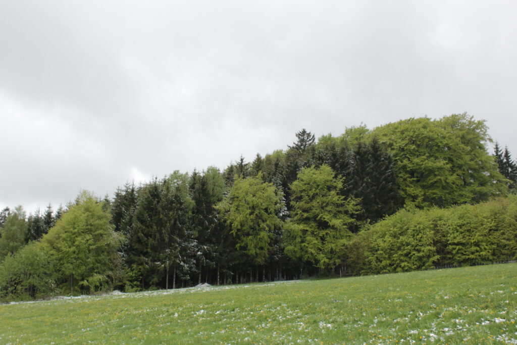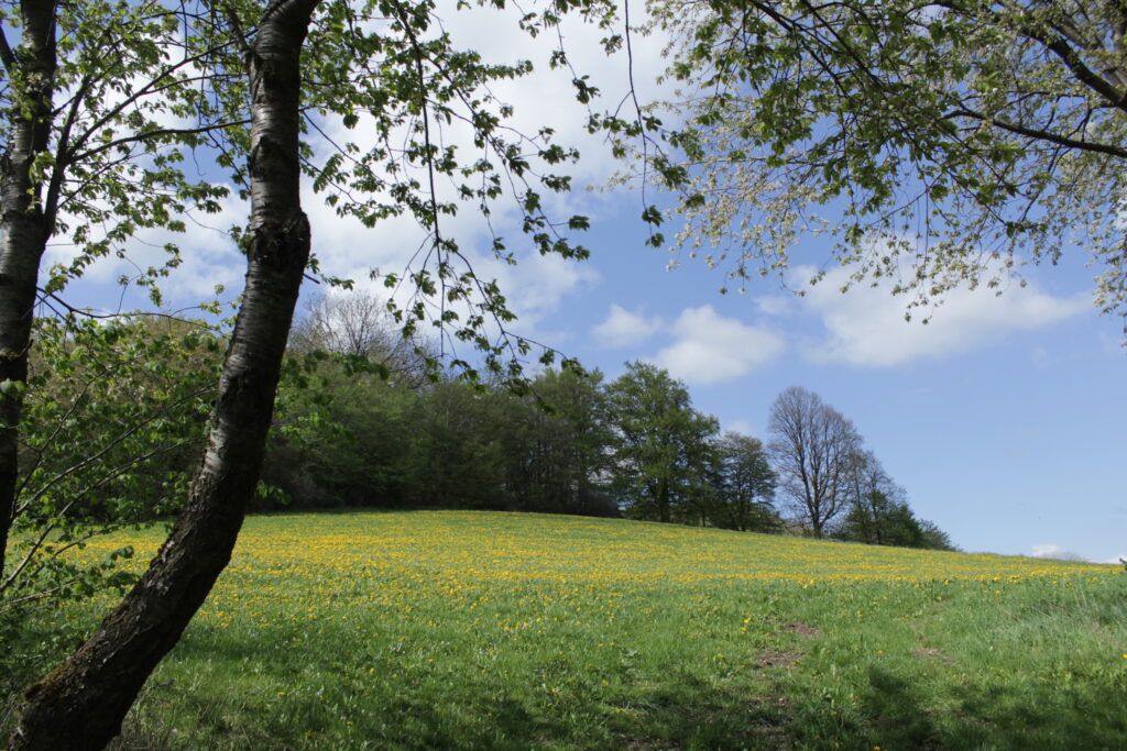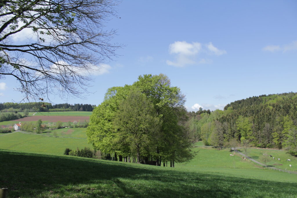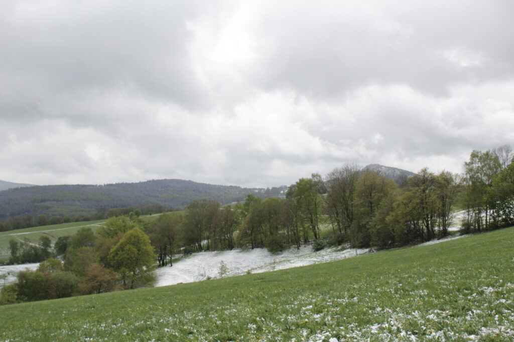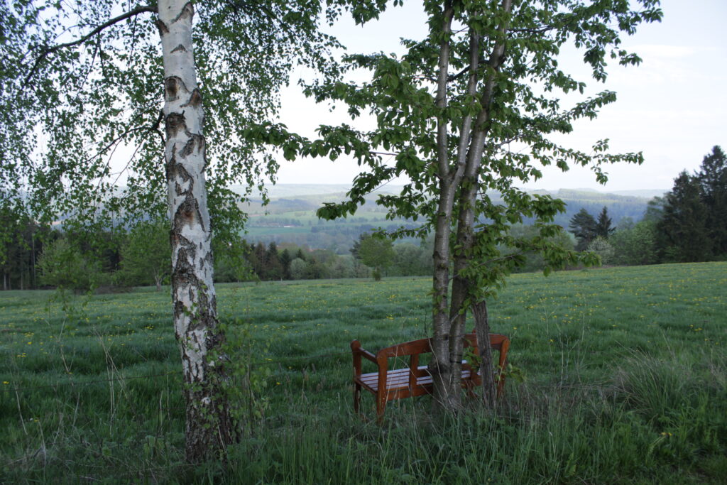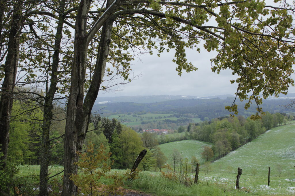 Der Harbachstein ist der Hügel, den man immer vom Wohnzimmer aus sieht. Der ist etwa 200m entfernt vom Haus. Auf der anderen Seite des Harbachsteins kann man sowohl die Wasserkuppe wie auch die Milseburg sehen (auf den beiden letzten Fotos).