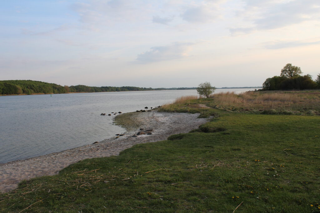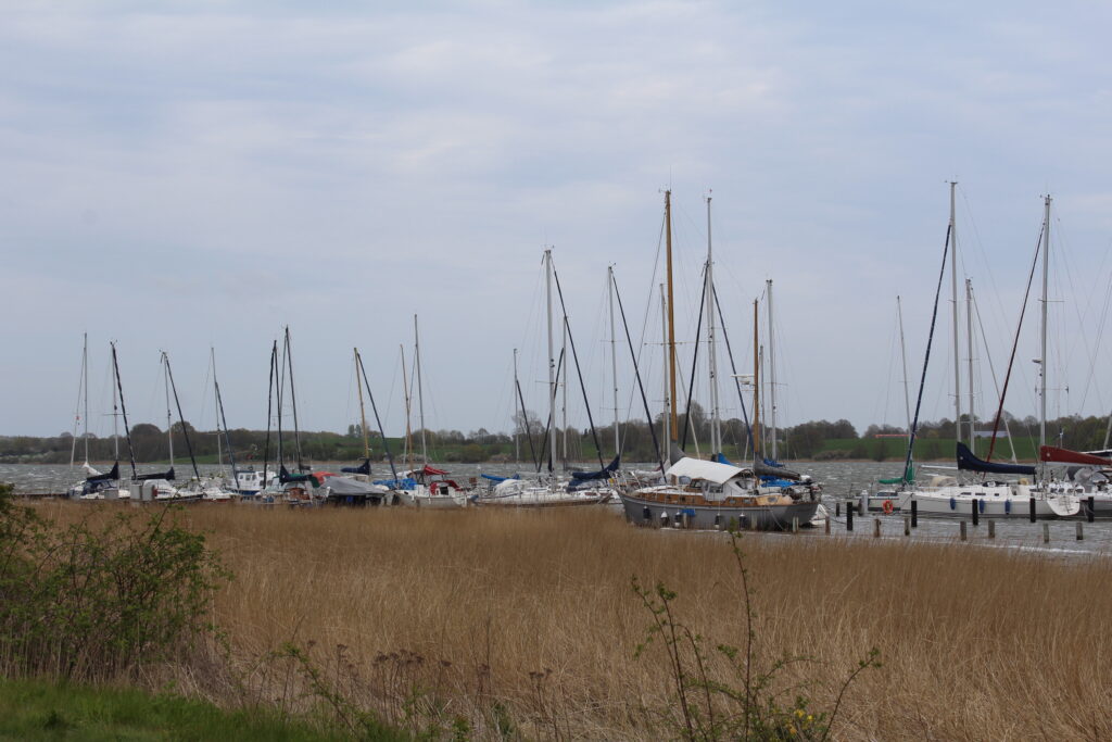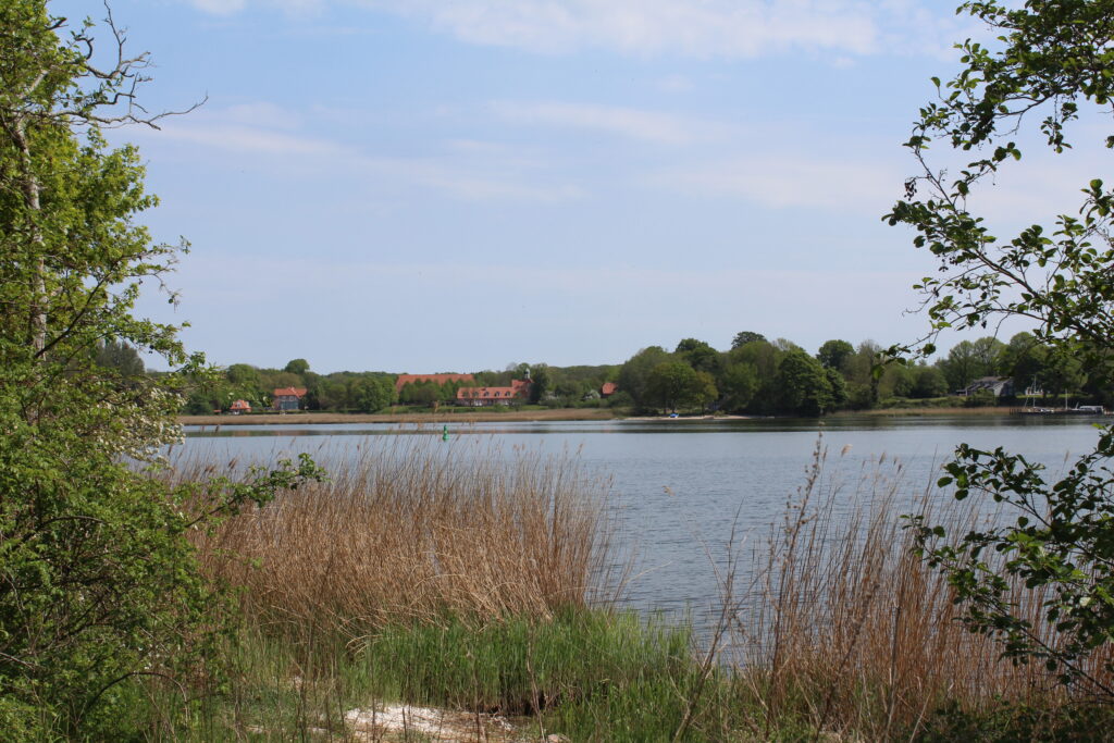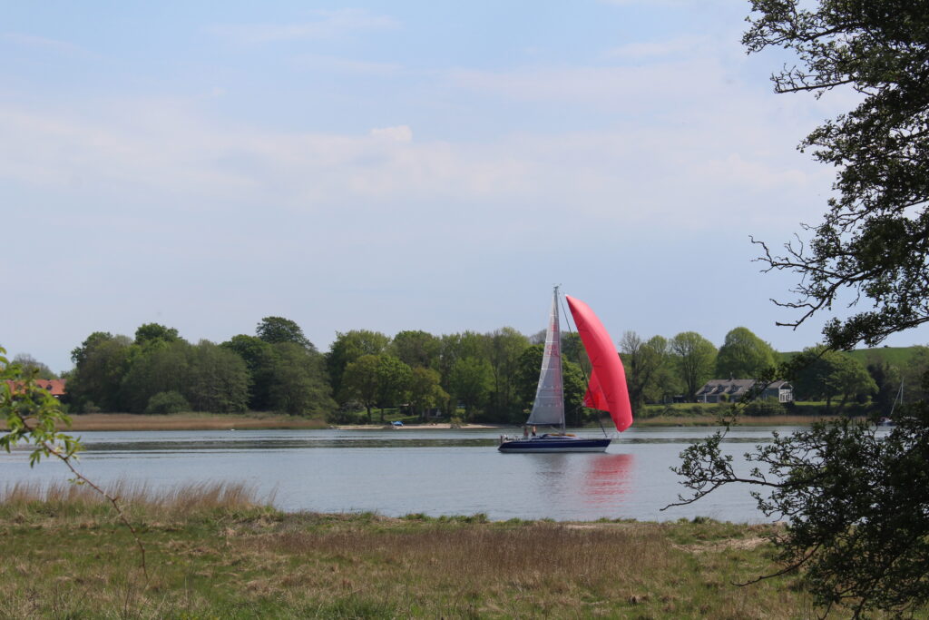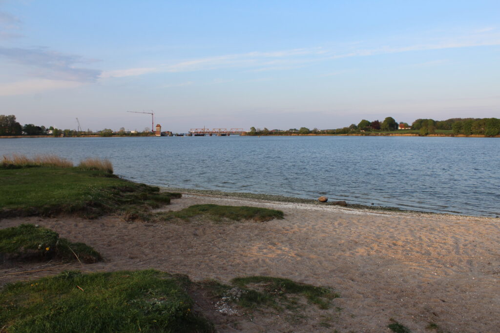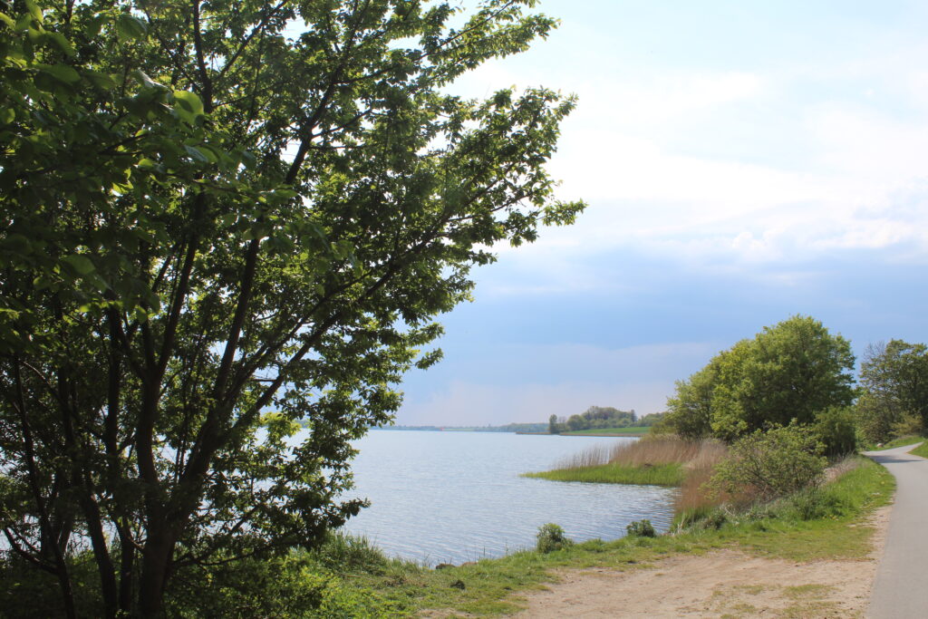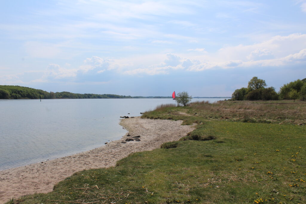 Ca. 10 Tage später sah es schon ganz anders aus, der erste fast-Sommer-Tag! Sehr schön, im Hintergrund schon die Gewitterwolken, aber das Gewitter zog an uns vorbei. Bei der „Hängematte“ ist ein kleiner Badestrand mit Blick auf die Klappbrücke und auf die Schlei mit Segelbooten, wenngleich da wenig Wind war. Und der Weg bis zum Ende der Halbinsel war schon richtig sommerlich. Schön!!