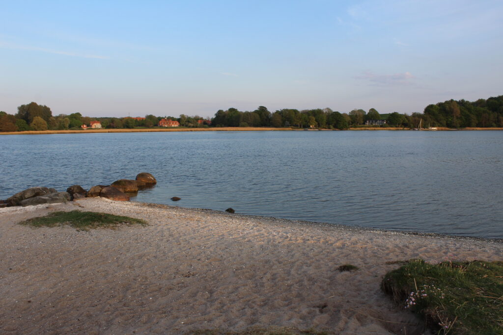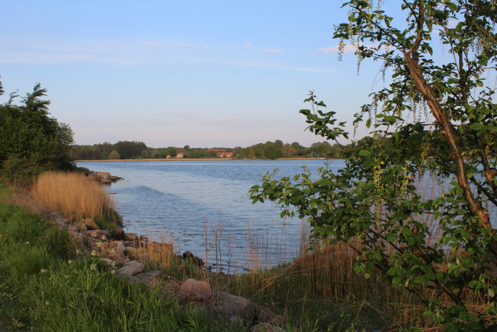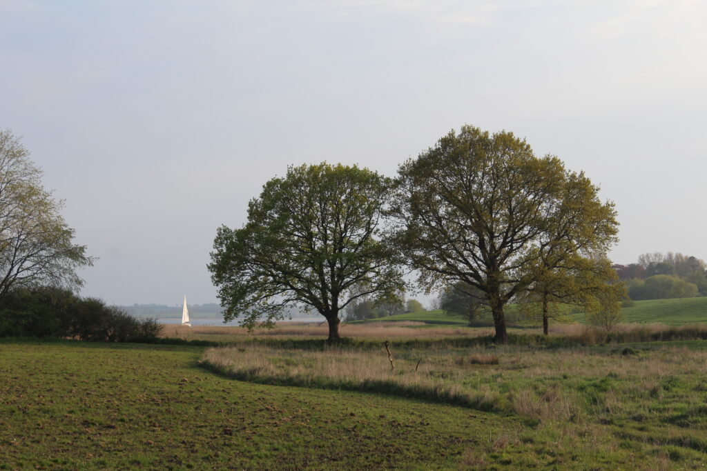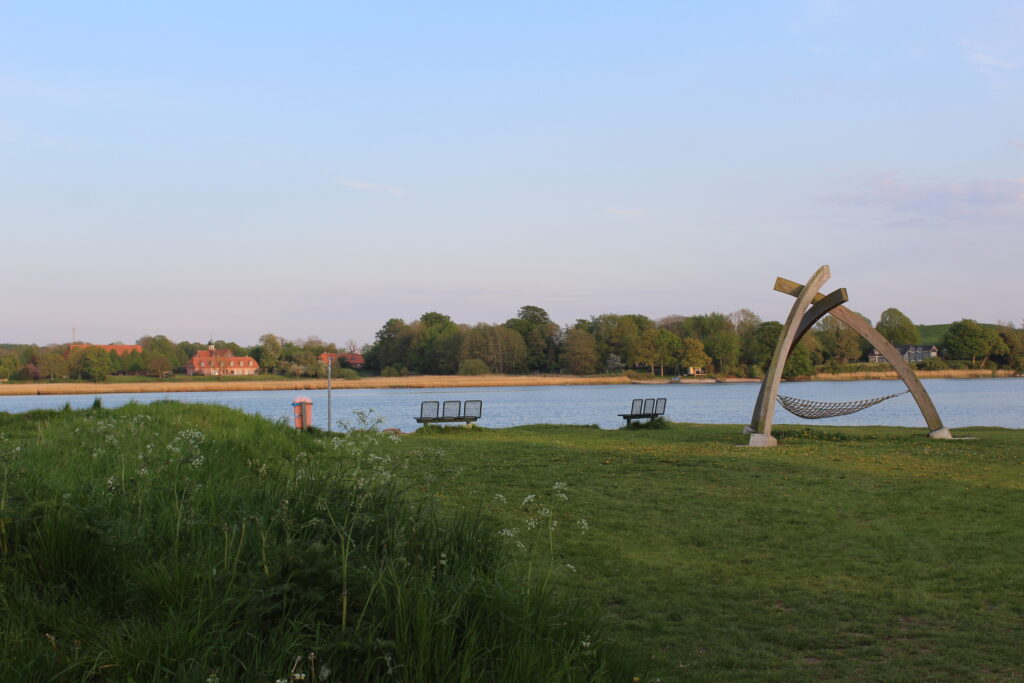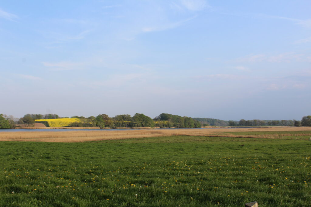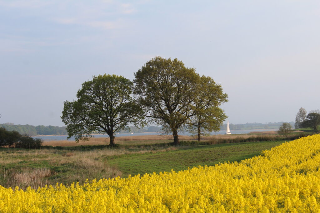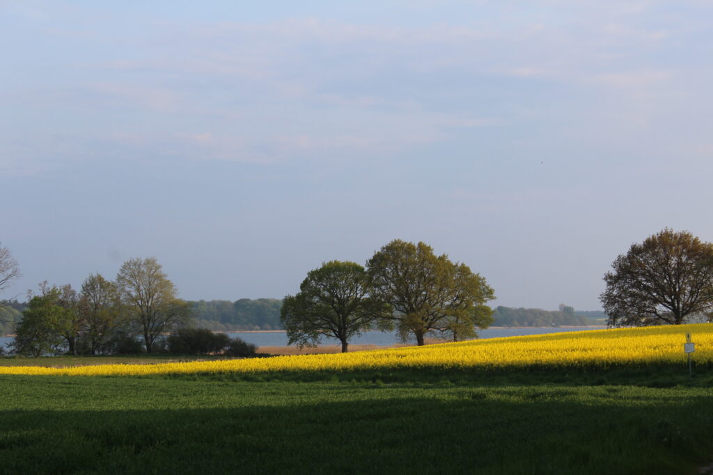 Ca. 10 Tage später sah es schon ganz anders aus, der erste fast-Sommer-Tag! Sehr schön, im Hintergrund schon die Gewitterwolken, aber das Gewitter zog an uns vorbei. Bei der „Hängematte“ ist ein kleiner Badestrand mit Blick auf die Klappbrücke und auf die Schlei mit Segelbooten, wenngleich da wenig Wind war. Und der Weg bis zum Ende der Halbinsel war schon richtig sommerlich. Schön!!