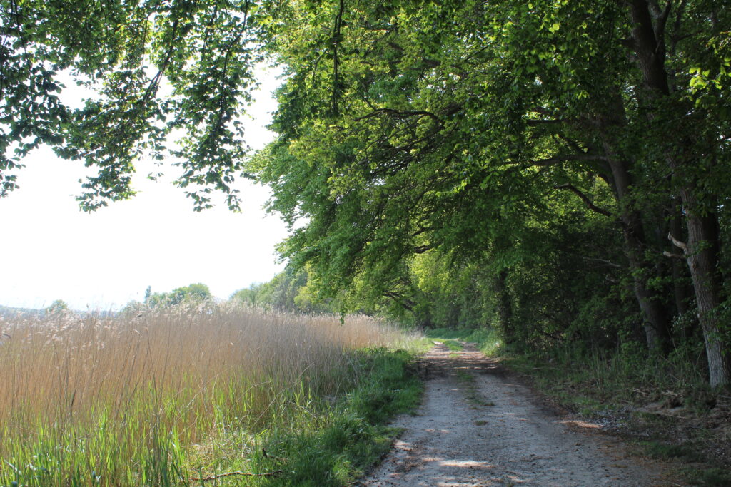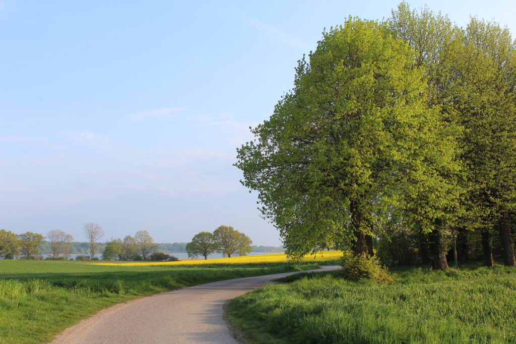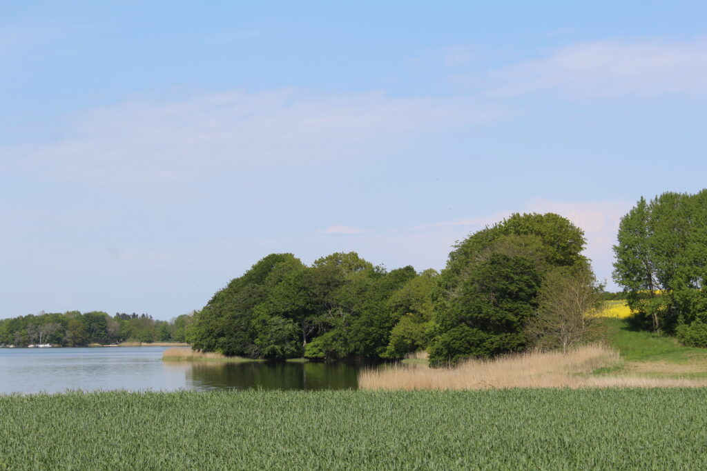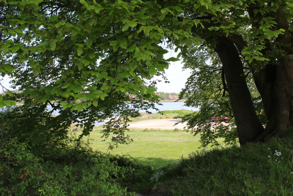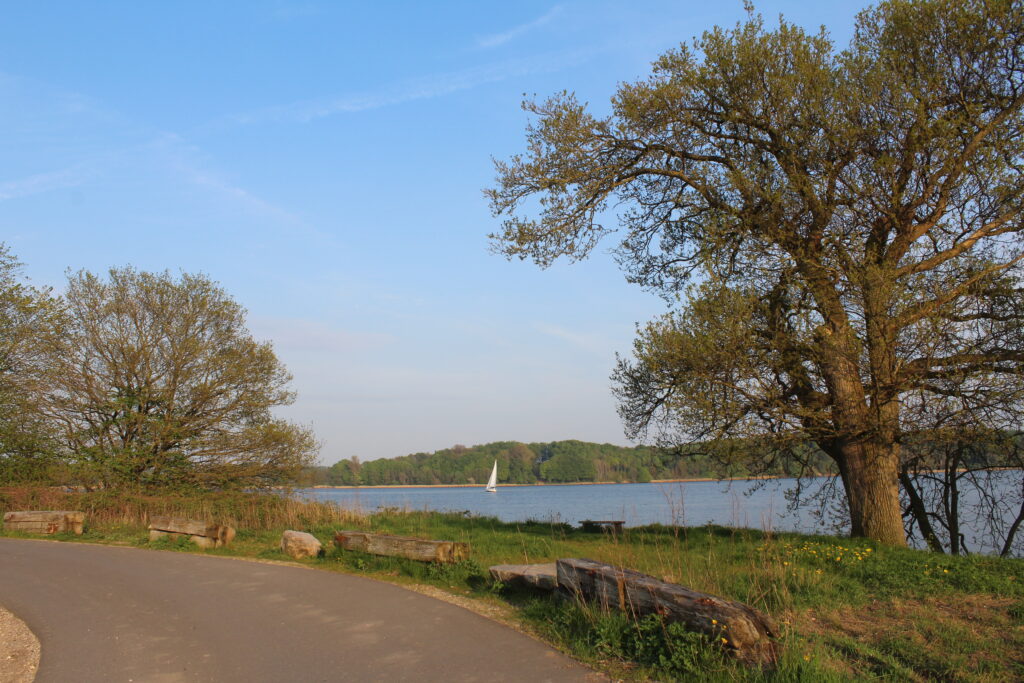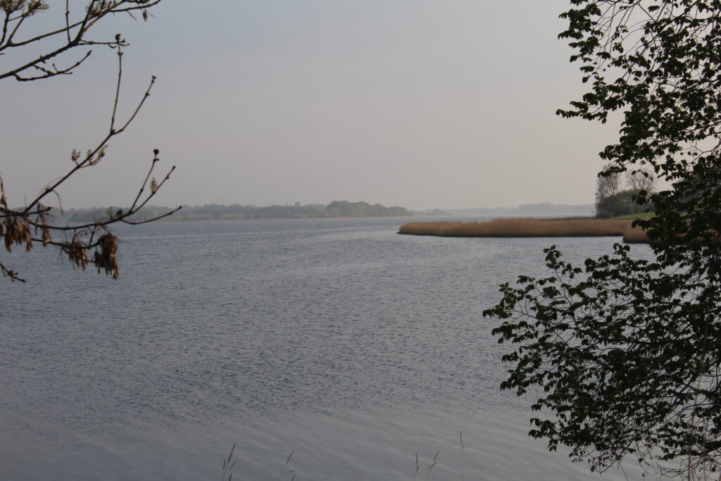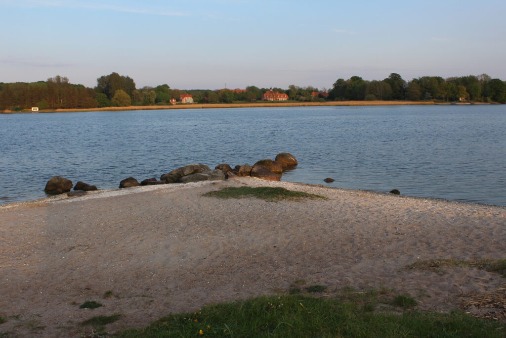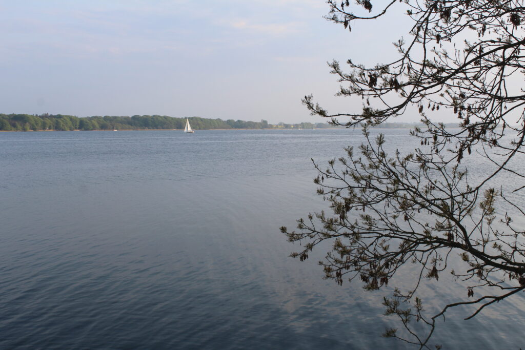 Ca. 10 Tage später sah es schon ganz anders aus, der erste fast-Sommer-Tag! Sehr schön, im Hintergrund schon die Gewitterwolken, aber das Gewitter zog an uns vorbei. Bei der „Hängematte“ ist ein kleiner Badestrand mit Blick auf die Klappbrücke und auf die Schlei mit Segelbooten, wenngleich da wenig Wind war. Und der Weg bis zum Ende der Halbinsel war schon richtig sommerlich. Schön!!