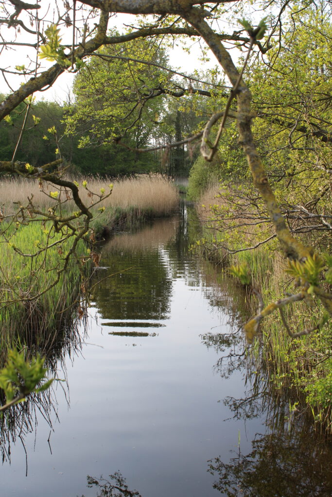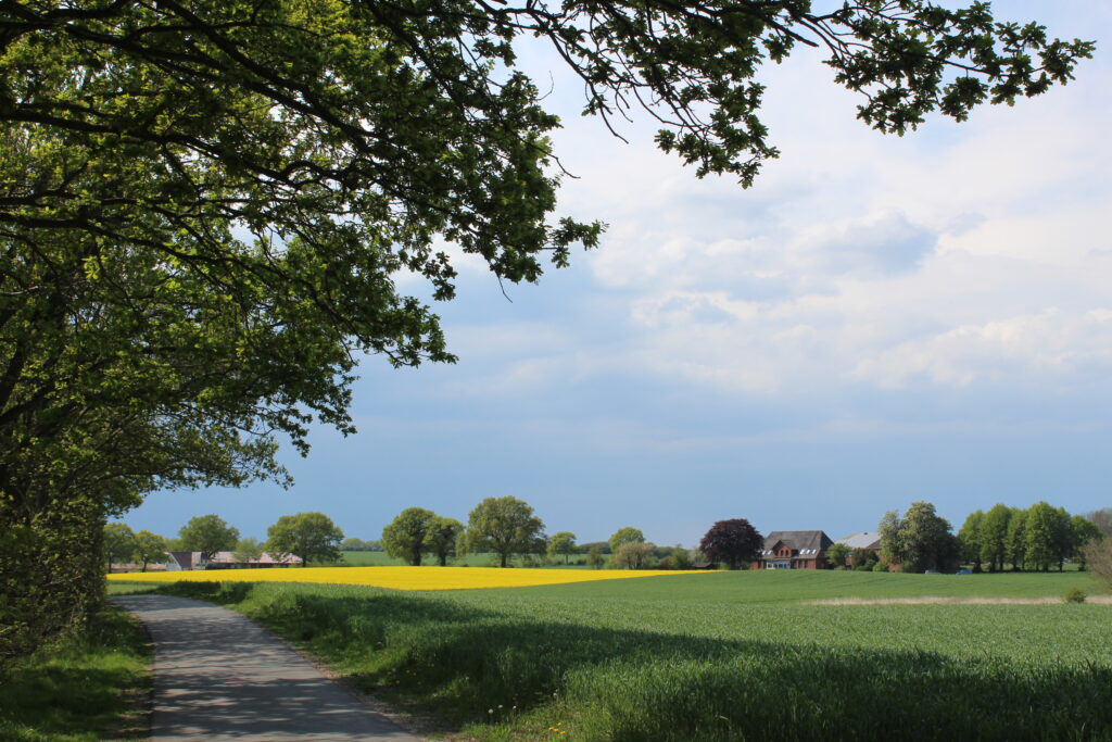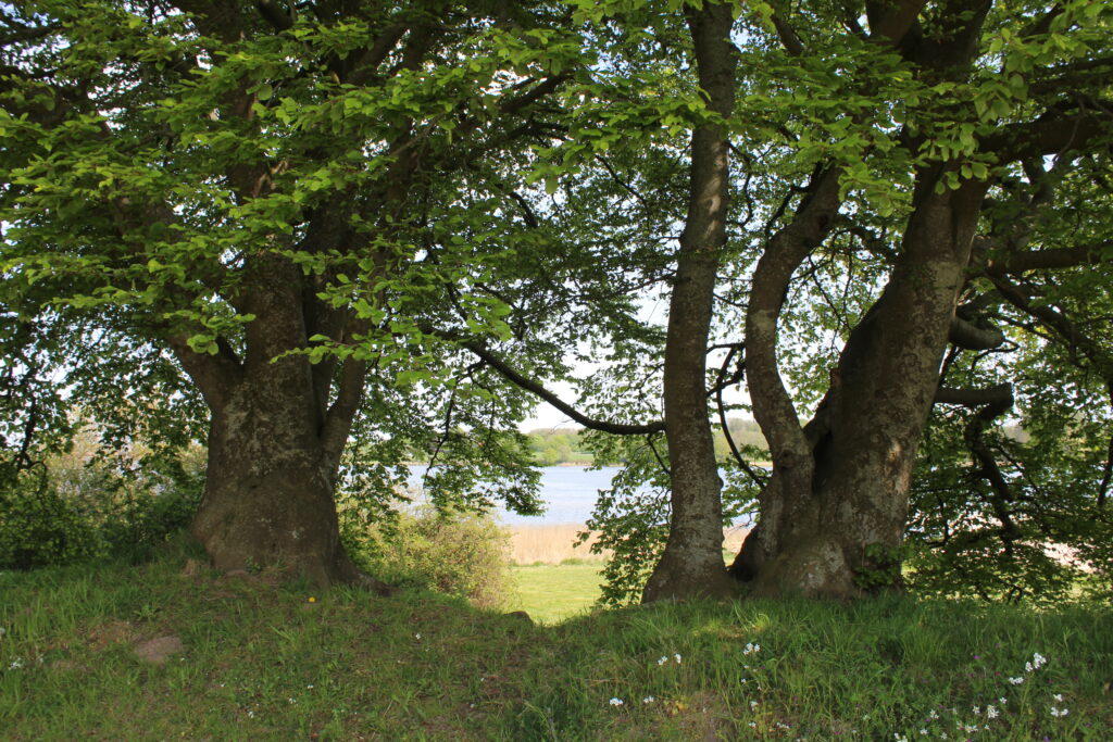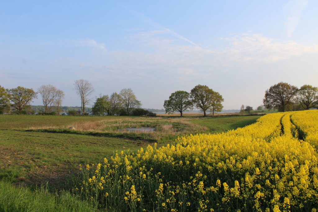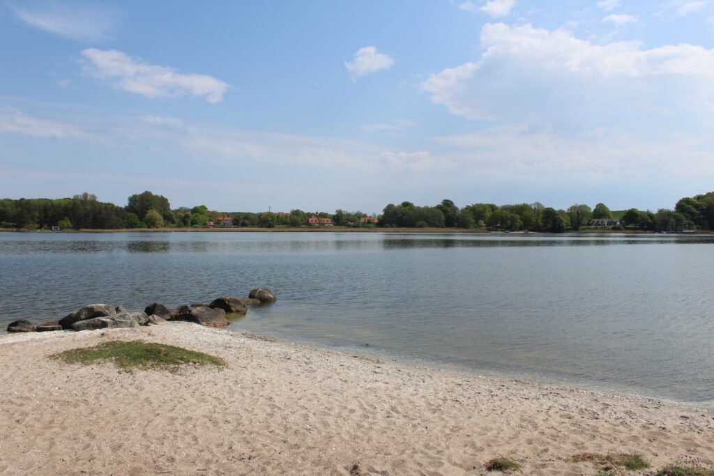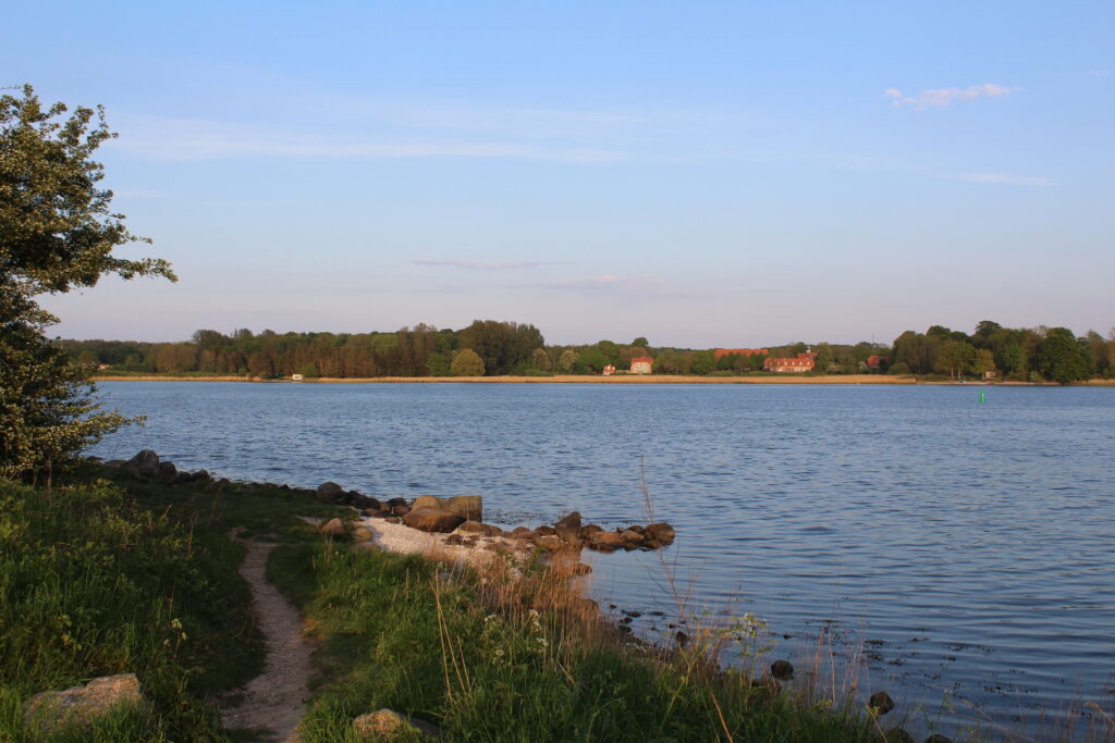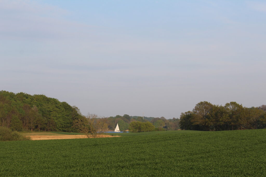 Ca. 10 Tage später sah es schon ganz anders aus, der erste fast-Sommer-Tag! Sehr schön, im Hintergrund schon die Gewitterwolken, aber das Gewitter zog an uns vorbei. Bei der „Hängematte“ ist ein kleiner Badestrand mit Blick auf die Klappbrücke und auf die Schlei mit Segelbooten, wenngleich da wenig Wind war. Und der Weg bis zum Ende der Halbinsel war schon richtig sommerlich. Schön!!