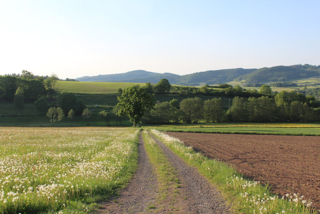 Eckweißbach ist ein Nachbarort von Harbach – auch von dort hat man den Blick auf Milseburg und Wasserkuppe: